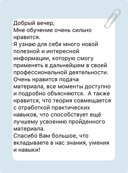 Еженедельные встречи в онлайн формате. После обучения организуется офлайн-практикум с нашими специалистами.