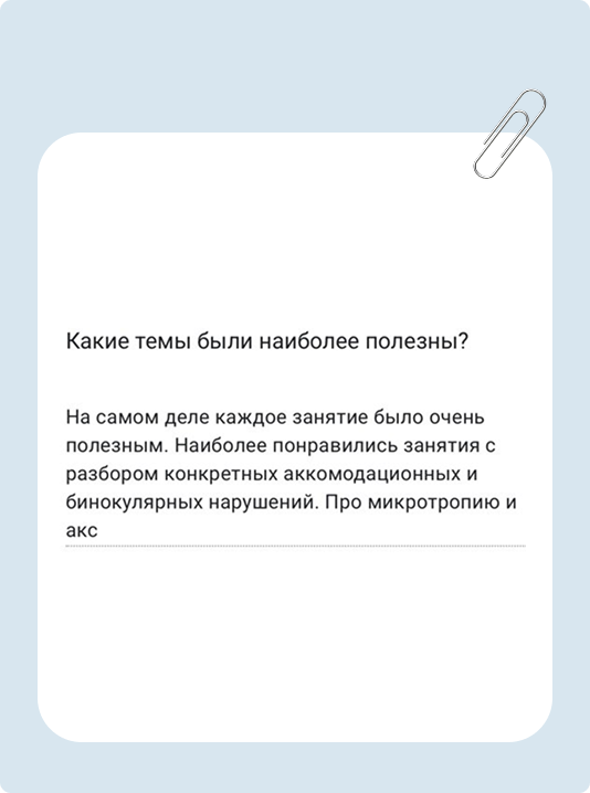 Мы начинаем с диагностики уровня специалистов и оценки текущих процессов. Затем вместе формируем цели и траекторию обучения. Программа подходит как начинающим, так и практикующим врачам и оптометристам.